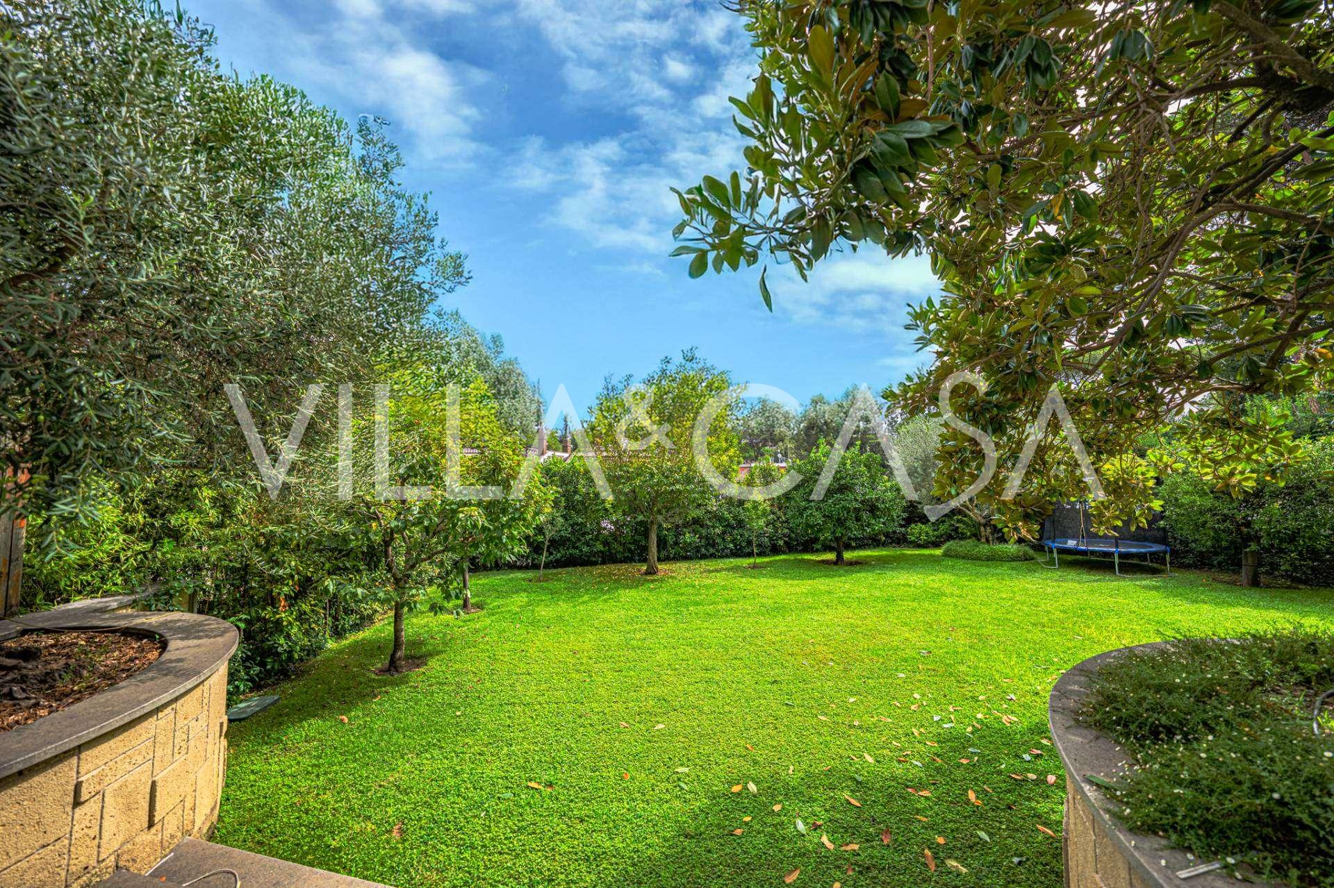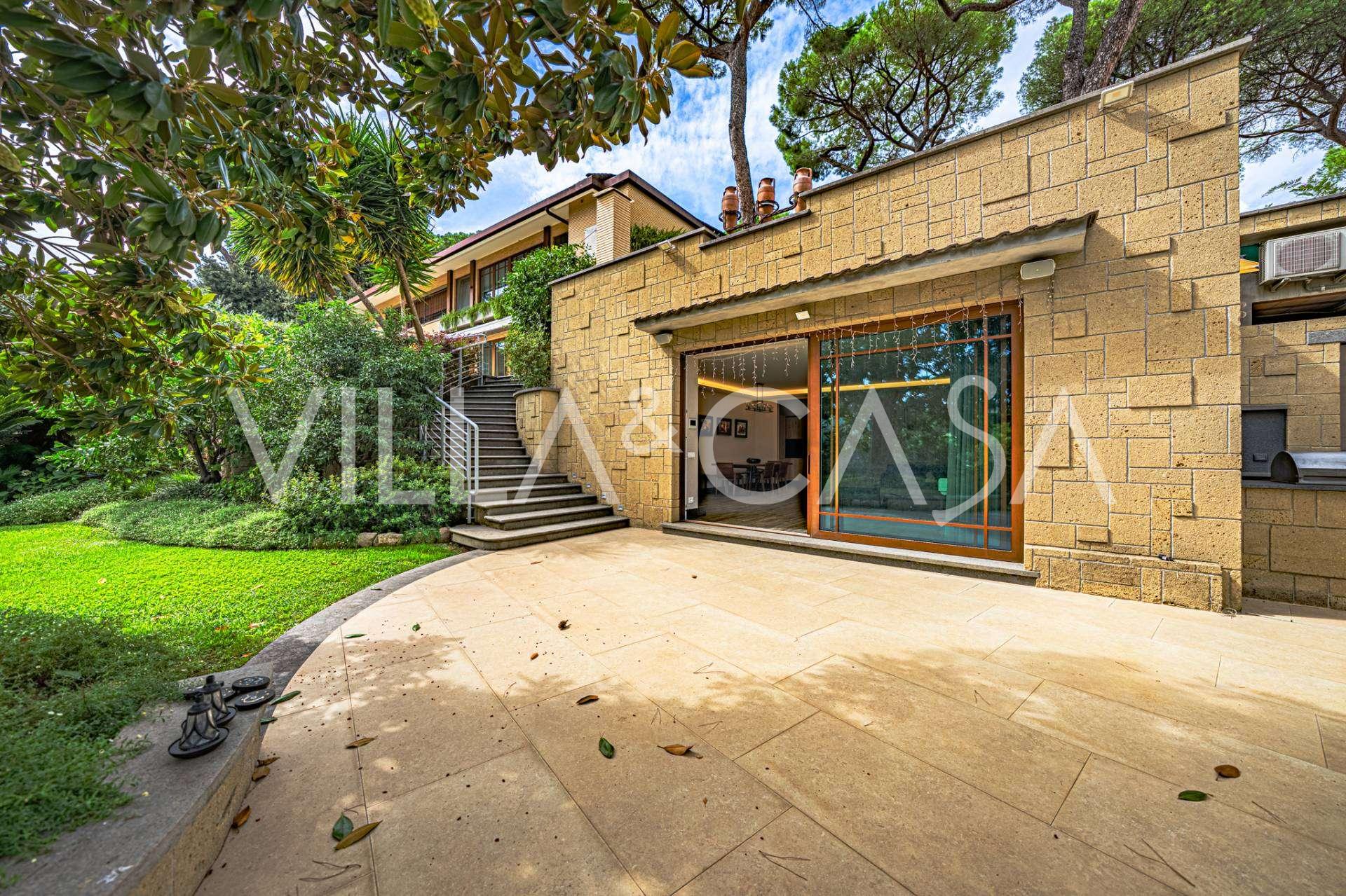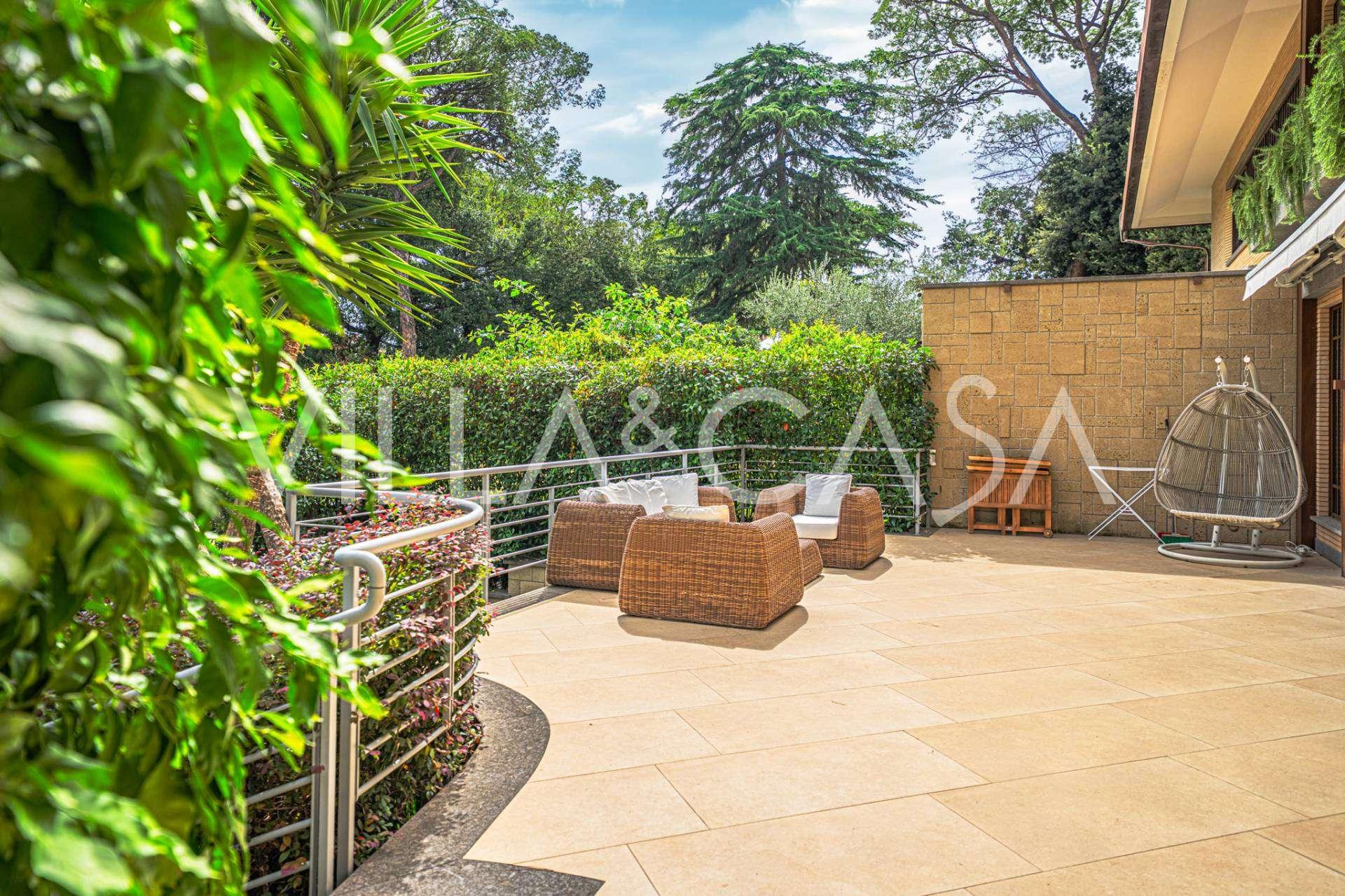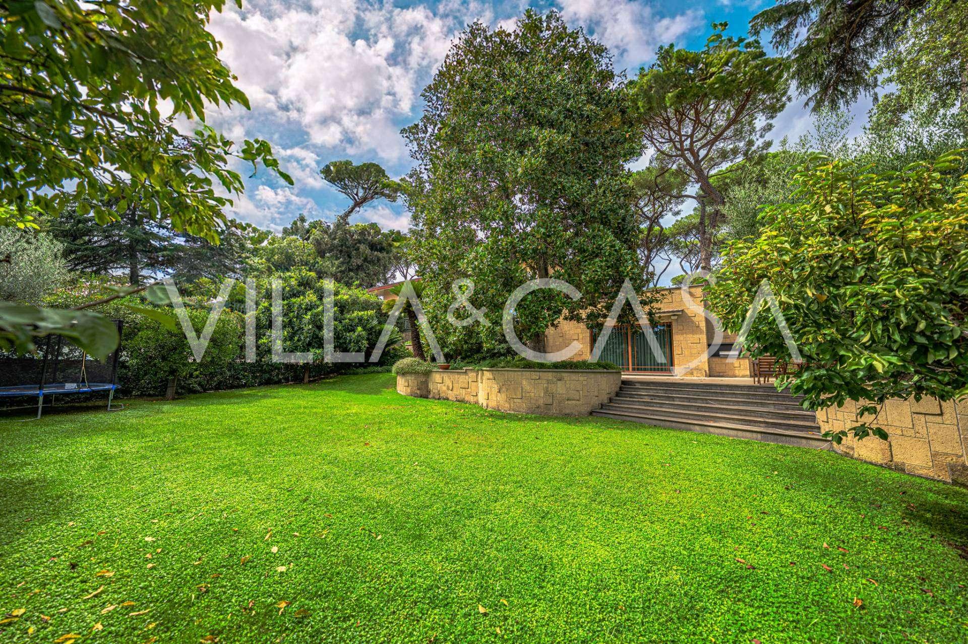 גן נוף שנוצר עם תשומת לב מיוחדת לפרטים, מעוטר בעצים נדירים, ביניהם מגנוליה מרשימה וזית בן מאות שנים. החצר הקדמית מכילה מספר רכבים, ויש גם מוסך סגור לרכב אחד. המיקום המושלם של האחוזה משלב שקט נדיר ומיקום אסטרטגי: במרחק הליכה נמצאים השירותים העיקריים ויציאה נוחה לפארק עם אגם EUR, כמו גם לשדרות Laurentina ו-Christoforo Colombo. תוך מספר דקות ניתן להגיע למרכז רומא.