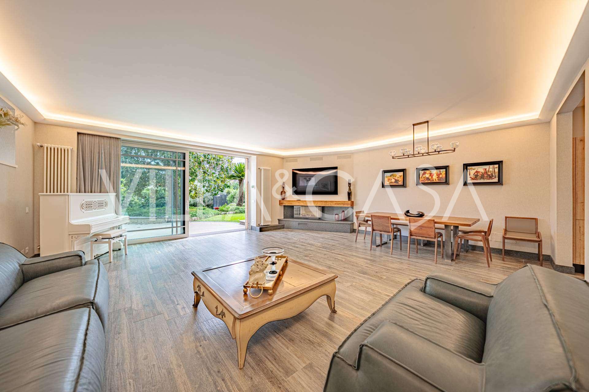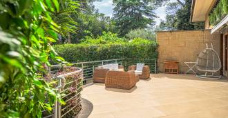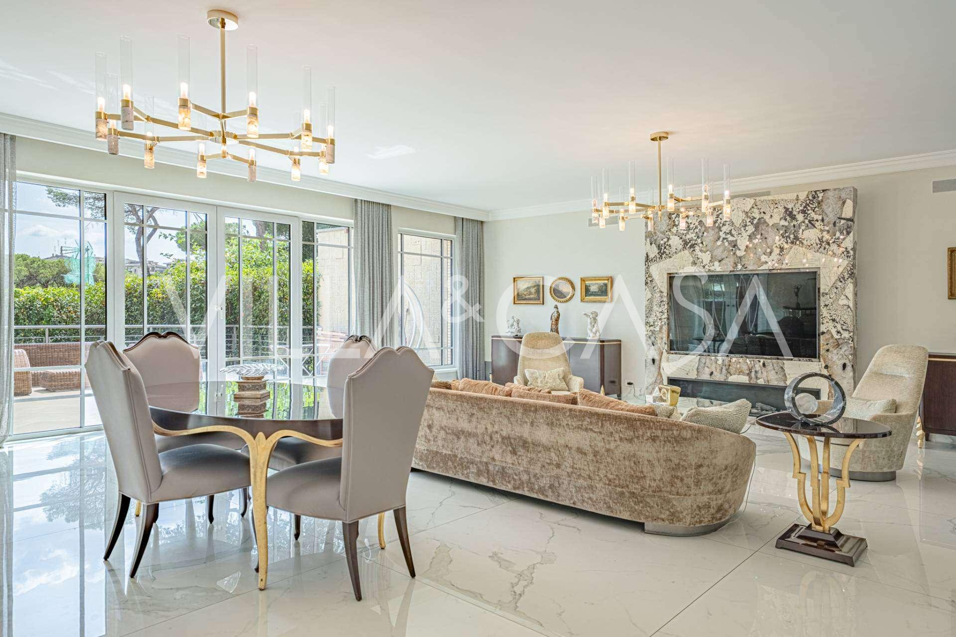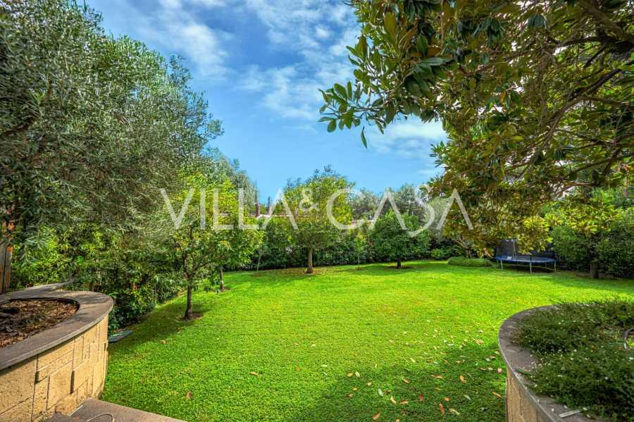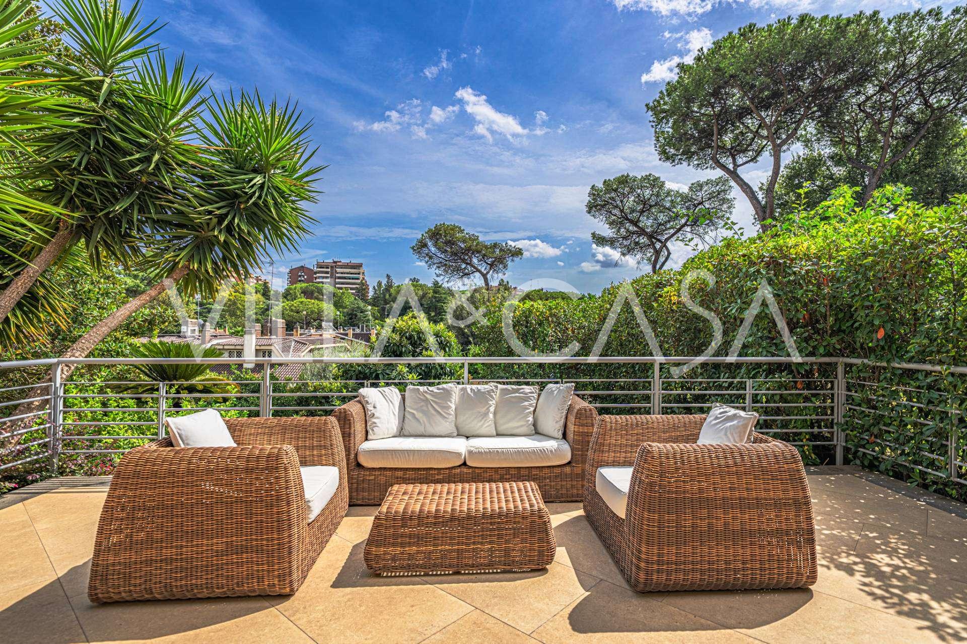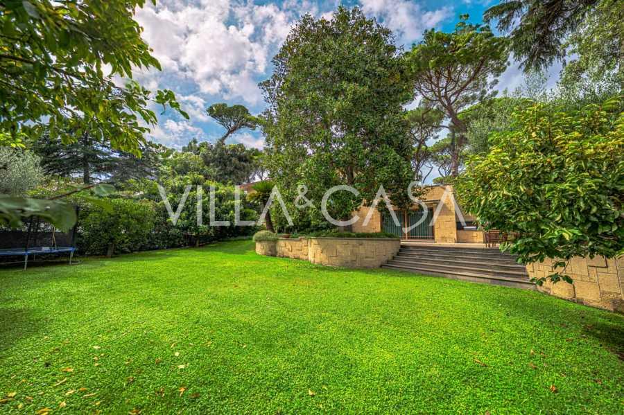 גן נוף שנוצר עם תשומת לב מיוחדת לפרטים, מעוטר בעצים נדירים, ביניהם מגנוליה מרשימה וזית בן מאות שנים. החצר הקדמית מכילה מספר רכבים, ויש גם מוסך סגור לרכב אחד. המיקום המושלם של האחוזה משלב שקט נדיר ומיקום אסטרטגי: במרחק הליכה נמצאים השירותים העיקריים ויציאה נוחה לפארק עם אגם EUR, כמו גם לשדרות Laurentina ו-Christoforo Colombo. תוך מספר דקות ניתן להגיע למרכז רומא.